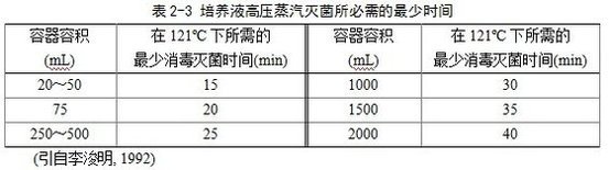 灭菌器内冷空气,以便使蒸汽能到达各个消毒部位,保证消毒灭菌彻底。然后继续加压加热,当压力表读数达到1.0~1.1 kg/cm2为121 ºC,保持15~20 min即可。由于消毒灭菌效果取决于温度而不是压力,所以在一定压力下保持较长的消毒灭菌时间是必须的。在121 ºC的蒸汽温度下可以很快杀死各种细菌及高度耐热的芽孢杆菌,因此许多培养液的消毒灭菌压力、温度一般保持在1.0~1.1 kg/cm2、121 ºC。消毒灭菌时间与需要消毒灭菌的培养液量密切相关(表2-3),时间不足达不到灭菌效果,时间过长培养液内的一些化学物质遭到破坏,影响培养液成分。消毒灭菌结束后,关闭热源,只有当