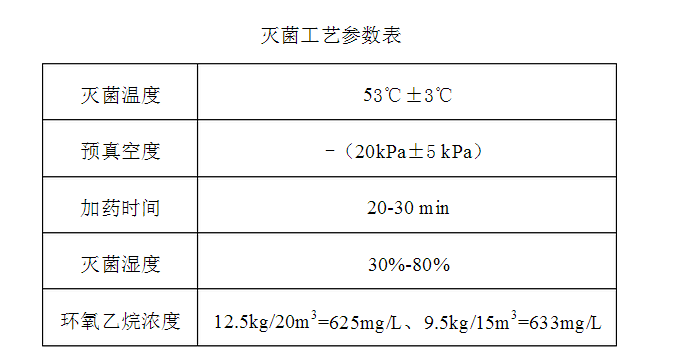 300~1000mg/L是当今常用的条件。我公司的环氧乙烷溶度:12.5kg/20m3=625mg/L、9.5kg/15m3=633mg/L。 应考虑以下因素的影响: 1)产品的装载量; 2)加入时所需的时间; 3)环氧乙烷残留量。 五、灭菌时间