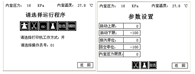 菌过程的温度、压力、时间、过程阶段、预置参数等均在触摸屏显示器中自动显示并可以随时储存,并配有微型打印机进行打印工作过程参数以便于归档、备查。此外,该控制系统配备有一套完整的自测及校正程序,可以实现不同海拔高度下、不同地区的压力、温度等参数的校正;还具有多级控制保护、帮助功能。