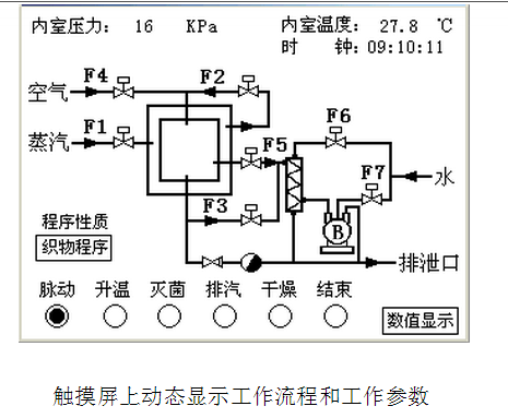 其它元件组成一套完整的控制系统,一般共配备了五套灭菌程序(织物程序﹑器械程序﹑液体程序﹑BD实验、自选程序),您可以根据需要选择应用,也可以根据实际情况改变工作参数。触摸屏可实时显示程序运行的每一过程状态。