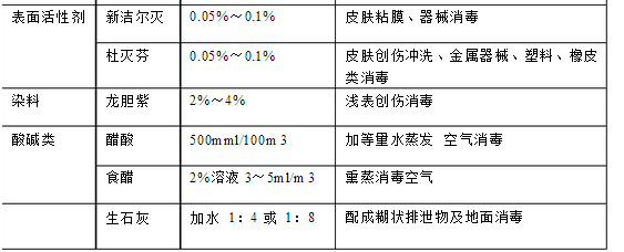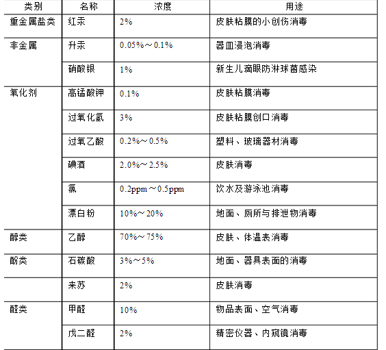 具有杀死微生物的化学药物称消毒剂。消毒剂对人体有毒性作用,只能外用,不能内服。主要用于皮肤粘膜的伤口、器械、排泄物和周围环境的消毒。消毒剂在低浓度时也可作防腐用,但防腐剂的关键是应要对人体无毒性作用。消毒剂种类浓度与用途见表 13-1。 常用消毒剂的种类浓度与用途