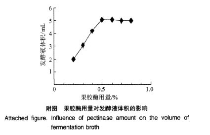 由附图可知,果胶酶的添加量为0.2%~0.5%时,滤液的体积随果胶酶的添加而增加,添加量>0.5%后再增加果胶的用量,滤液体积增加幅度较小,因此果胶酶的用量以0.5%为宜。