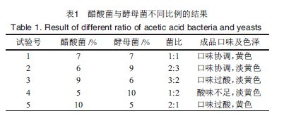 在发酵液中,酵母菌利用发酵液中的糖分,发酵成酒精,同时醋酸菌把生成的酒精转化成醋酸,酸化发酵液,不同的菌比所产生的效果(表1)可知,选择醋酸菌和酵母菌
