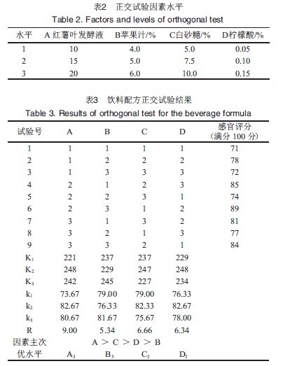 **优水平为A2B3C2D2,即红薯叶发酵饮料的**优配方为红薯叶发酵液15%,苹果汁6.0%,白砂糖7.5%,柠檬酸0.10%,为了保持饮料的稳定性,添加β-环糊精,添加量为0.8%。按正交试验得出的配方进行饮料配制,得到的饮料经感官评分为90分,说明此配方**佳。